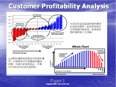 圖3右下角的鯨狀圖進(jìn)一步地說明了情況:它根據(jù)客戶分配成本,而更清楚地看到客戶收益性。行動(dòng)成本計(jì)算或ABC可以使確保您的業(yè)務(wù)實(shí)現(xiàn)贏利的關(guān)鍵成本更清楚易懂。讓我們看一個(gè)例子,來比較兩種獲得和保持手機(jī)用戶的不同的方法。你將看到該高水平分析法可以很充分地使對(duì)呼叫中心利潤的基本要素有更深的理解。