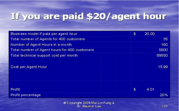 根據(jù)圖表12,我們可以算出第二種方式的利潤(rùn)百分比。如果我們假設(shè)每個(gè)客戶每年的收入是20,000美元,其中分配給呼叫中心部門的收入是20%。我們每個(gè)客戶每月的收入是333.33美元,每個(gè)客戶月的成本是223.88美元(參見(jiàn)圖表10)。這導(dǎo)致我們來(lái)自每個(gè)客戶每月的利潤(rùn)是109.46美元——這將產(chǎn)生33%的利潤(rùn)率。