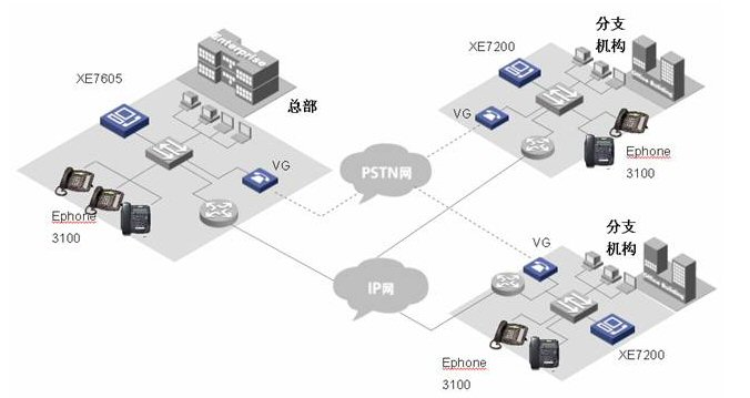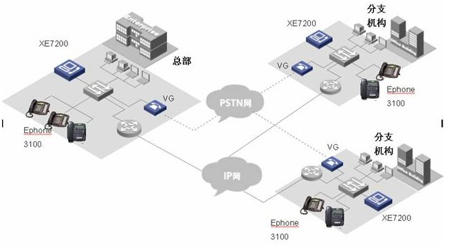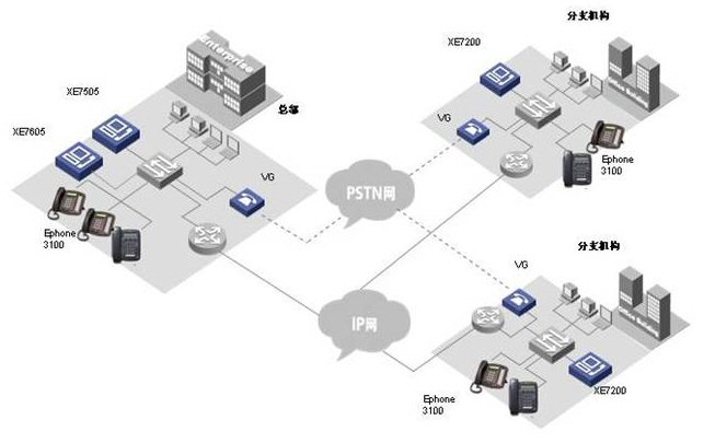 各小分支機(jī)構(gòu)的IP語音終端可以直接注冊到本地XE 7000上, 從而實(shí)現(xiàn)整網(wǎng)的分布式部署。