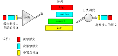 在報(bào)文到達(dá)路由設(shè)備接口后首先對(duì)報(bào)文進(jìn)行分類,然后按照?qǐng)?bào)文所屬的類別讓報(bào)文進(jìn)入所屬隊(duì)列的尾部,在報(bào)文發(fā)送時(shí)按照優(yōu)先級(jí)總是在所有優(yōu)先級(jí)較高的隊(duì)列中的報(bào)文發(fā)送完畢后再發(fā)送低優(yōu)先級(jí)隊(duì)列中的報(bào)文,這樣在每次發(fā)送報(bào)文時(shí)總是將優(yōu)先級(jí)高的報(bào)文先發(fā)出去,保證了屬于較高優(yōu)先級(jí)隊(duì)列的報(bào)文有較低的時(shí)延與丟失率。