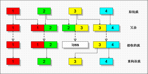 當(dāng)?shù)?個(gè)包在傳輸過程中丟失時(shí),由于包“3”被冗余編碼到第4個(gè)傳輸包中,在對(duì)端接收到碼流后還可以正常重構(gòu)出包“3”。