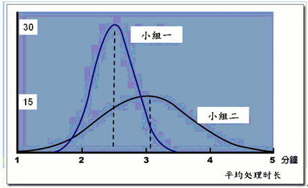 上面這張圖中,小組一的平均處理時長的標(biāo)準(zhǔn)差,顯然低于小組二,也就是小組一的座席員,大家處理時長差距都不大,都在2.5分鐘左右。