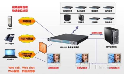 基于毅航通信ISX4000多媒體交換機(jī)的IVVR或視頻呼叫中心系統(tǒng)平臺可同時(shí)支持3G網(wǎng)絡(luò)、2G以及Internet網(wǎng)絡(luò)的接入;支持視頻、語音、傳真、郵件、短信等全方位服務(wù)模式;支持集中和IP分布式部署,座席數(shù)隨時(shí)隨地任意伸縮,可輕松形成一個(gè)跨區(qū)域、集語音和視頻于一體、統(tǒng)一的視頻呼叫中心系統(tǒng)。
