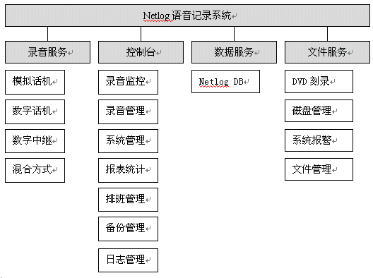 NetLog語(yǔ)音記錄系統(tǒng)采用基于分布式、多層控制管理體系的設(shè)計(jì)思想,將電話(huà)線(xiàn)路與內(nèi)部網(wǎng)絡(luò)有效地結(jié)合在一起,形成一套完整的語(yǔ)音錄制、管理系統(tǒng)。采用目前先進(jìn)的C/S模型,能更方便、快捷地實(shí)現(xiàn)控制臺(tái)對(duì)網(wǎng)絡(luò)內(nèi)所有記錄服務(wù)的狀態(tài)監(jiān)視,記錄查詢(xún),操作控制等,采用統(tǒng)一的管理化機(jī)制,使文件的管理和備份更簡(jiǎn)潔。