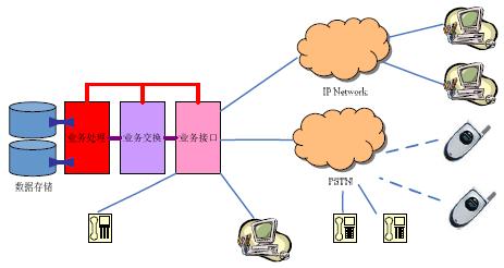 其中,業(yè)務接口部分為呼叫中心提供面向服務服務對象(客戶)的連接和面向服務者(座席)的連接接口,業(yè)務交換部分負責在請求服務的對象與提供服務提供者之間建立連接,業(yè)務處理部分負責對這些連接及服務內容進行管理和維護,數(shù)據(jù)存儲部分則為所有服務提供必要的數(shù)據(jù)資源和數(shù)據(jù)備份。