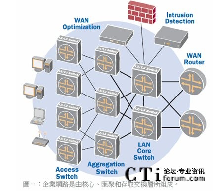 復(fù)雜的網(wǎng)絡(luò)拓?fù)?/b>:網(wǎng)絡(luò)架構(gòu)因內(nèi)含龐雜的多層網(wǎng)絡(luò),而變得越來(lái)越復(fù)雜。目前多數(shù)企業(yè)網(wǎng)絡(luò)都是三層式拓?fù),包括?shù)據(jù)匯聚層或分發(fā)層。許多網(wǎng)絡(luò)都已部署了匯聚交換機(jī),以彌補(bǔ)傳統(tǒng)存取及核心交換機(jī)欠缺高速光纖接口的缺陷,以便支持直接的連接。有些企業(yè)甚至建立了第四層網(wǎng)絡(luò),由連接到核心交換機(jī)的核心路由器組成。這樣的網(wǎng)絡(luò)架構(gòu)雖然可以發(fā)揮一定的作用,但卻大幅增加了資本支出,造成操作流程過(guò)于復(fù)雜,并為管理帶來(lái)沉重負(fù)擔(dān)。此外,這類(lèi)架構(gòu)也會(huì)增加網(wǎng)絡(luò)的等待時(shí)間,并導(dǎo)致超額負(fù)載的情況出現(xiàn),因而降低了應(yīng)用效能。