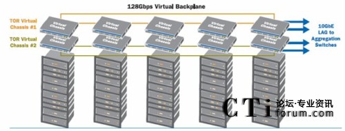 虛擬機(jī)架交換機(jī)可部署于任何可部署傳統(tǒng)的機(jī)架或堆疊交換機(jī)的地方,包括公司分支機(jī)構(gòu)、布線箱及數(shù)據(jù)中心等。如果將虛擬機(jī)架平臺(tái)部署于數(shù)據(jù)中心,則可簡(jiǎn)化服務(wù)器的連接,例如可解決傳統(tǒng)機(jī)架式平臺(tái)令人頭痛的線路管理問(wèn)題,或是減少堆疊式交換機(jī)的數(shù)量。舉例而言,IT人員可在兩個(gè)服務(wù)器機(jī)架中,配置兩臺(tái)由五個(gè)獨(dú)立交換機(jī)組成的虛擬機(jī)架交換機(jī),并將其視管理兩臺(tái)交換機(jī),而不是逐一連接并管理安裝于五個(gè)機(jī)架中的10臺(tái)獨(dú)立的堆疊式交換機(jī)。這樣,IT網(wǎng)管人員將可減少80%的管理負(fù)擔(dān)(參見(jiàn)圖三)。