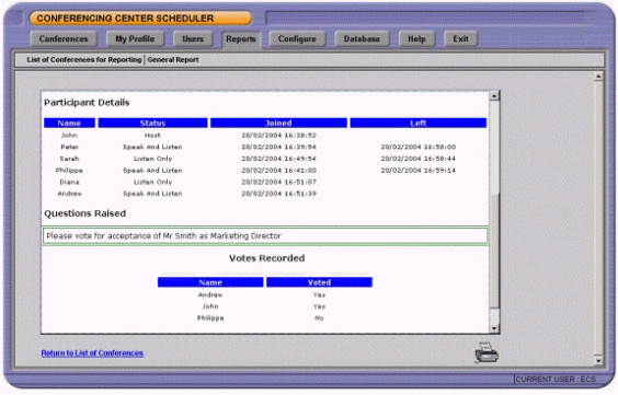 管理員可以生成會(huì)議使用率和每個(gè)會(huì)議的報(bào)告。消息內(nèi)容包括會(huì)議名稱,ID號(hào),會(huì)議起始日期,會(huì)議持續(xù)時(shí)間和與會(huì)人員的數(shù)目。每個(gè)會(huì)議報(bào)告可以列出與會(huì)人員的詳細(xì)列表和他們何時(shí)進(jìn)入/離開(kāi)會(huì)議。