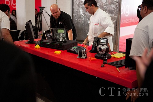 這個多層蛋糕在Avaya五月舉行的中小企業(yè)“大思維”市場活動中登場亮相,它在一張可食用的長會議桌上逼真呈現(xiàn)了工作中的Avaya電話、視頻會議解決方案和一套IP Office控制單元。 造型巧克力、谷類食品、軟糖及其它烘焙材料同各種必要的Avaya通信組件結(jié)合在一起制作出的這個蛋糕被Buddy命名為“科技蛋糕”。 在完成由巧克力仿制電話所撥打的語音通話、并成功支持Buddy和Avaya高級副總裁兼全球通信解決方案總裁Alan Baratz博士之間的實時視頻會議之后,這個蛋糕作為甜點供全體活動參加者享用。