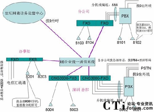 - 利用公共寬帶網(wǎng)絡(luò)(或公司內(nèi)部VPN網(wǎng)),實(shí)現(xiàn)總公司和各個(gè)分公司之間IP電話互通功能,傳真功能。從而免除總公司和各個(gè)分公司內(nèi)部溝通的通話費(fèi)用和傳真費(fèi)用;