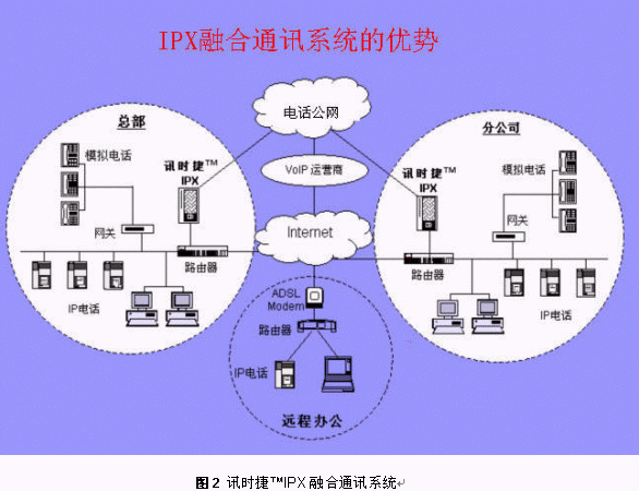 將訊時(shí)捷?IPX放在公司總部,其它分支機(jī)構(gòu)可以通過IP話機(jī),軟電話或者網(wǎng)關(guān)設(shè)備登錄到總部的IPX上,這樣就形成了整個(gè)公司的VOIP網(wǎng),建立了企業(yè)自己的通訊平臺(tái)。