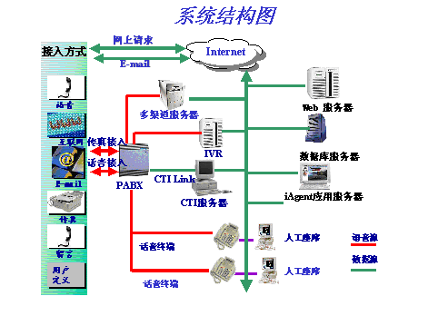 滿足呼叫中心多渠道接入的需求,使Internet呼叫中心成為現(xiàn)實(shí)。將網(wǎng)上ip電話請(qǐng)求納入傳統(tǒng)語(yǔ)音呼叫統(tǒng)一管理,無(wú)縫集成Email,傳真功能,實(shí)現(xiàn)網(wǎng)頁(yè)的互推瀏覽,文字交談,ip電話,網(wǎng)上資料發(fā)送等功能。