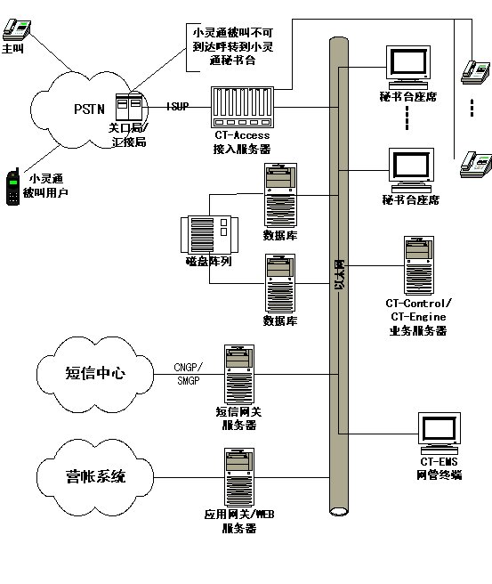 如上圖所示,小靈通秘書臺(tái)網(wǎng)絡(luò)拓?fù)鋱D,上圖中紅色虛線的左邊為運(yùn)營(yíng)商部分,紅線是接口部分, 紅色虛線的右邊是增加的小靈通秘書臺(tái)設(shè)備和工程實(shí)施部分。首先需要在小靈通網(wǎng)絡(luò)的關(guān)口局或者匯接局設(shè)置被叫不可到達(dá)(關(guān)機(jī)、忙、不在服務(wù)區(qū))呼叫前轉(zhuǎn),通過(guò)ISUP協(xié)議呼叫到小靈通秘書臺(tái)的CT-Access接入服務(wù)器,提取主叫號(hào)碼、被叫號(hào)碼、原被叫號(hào)碼,同時(shí)給主叫播放語(yǔ)音,"您撥的用戶無(wú)法接通,您可以選擇失話復(fù)得業(yè)務(wù),本業(yè)務(wù)每條短信收費(fèi)0.1元,漏話提示請(qǐng)按1號(hào)鍵,短信回叫請(qǐng)按2號(hào)鍵,轉(zhuǎn)人工請(qǐng)按9號(hào)鍵"。然后根據(jù)主叫的響應(yīng)選擇提供服務(wù)(業(yè)務(wù)流程見(jiàn)第3章)。小靈通秘書臺(tái)的業(yè)務(wù)部分由CT-Control/CT-Engine業(yè)務(wù)服務(wù)器和數(shù)據(jù)庫(kù)服務(wù)器組成,另外包括人工臺(tái)和短信網(wǎng)關(guān),短信網(wǎng)關(guān)通過(guò)CNGP(網(wǎng)通)、SMGP(電信)和短信中心網(wǎng)關(guān)接口,實(shí)現(xiàn)短信發(fā)送功能。業(yè)務(wù)網(wǎng)關(guān)和WEB服務(wù)器為可選部分,根據(jù)業(yè)務(wù)需要選配。