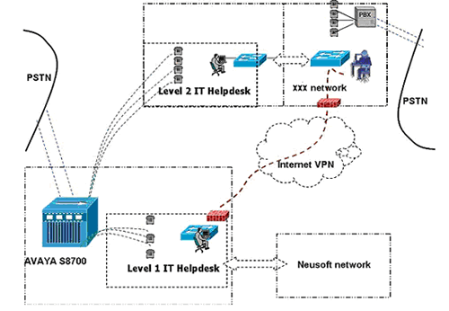實(shí)施中,A公司的IT Helpdesk服務(wù)熱線(xiàn)號(hào)碼直接路由至東軟呼叫中心平臺(tái),Level 1座席用東軟呼叫中心的分機(jī)提供在線(xiàn)服務(wù);Level