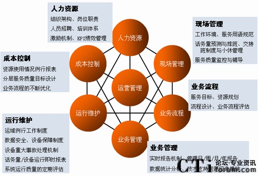 一般來(lái)講,呼叫中心的運(yùn)營(yíng)管理由人力資源、現(xiàn)場(chǎng)管理、成本控制、運(yùn)行維護(hù)、業(yè)務(wù)管理、業(yè)務(wù)流程六種要素組成。這六者之間的關(guān)系正如下圖所示: