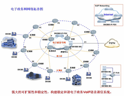 MG和BN2000 IP PBX就可以利用電子政務(wù)網(wǎng)自身的優(yōu)勢,實(shí)現(xiàn)VoIP語音通信。電子政務(wù)網(wǎng)內(nèi)的所有IP電話用戶統(tǒng)一在核心層的BN2000