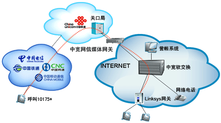 企業(yè)或個(gè)人自行從網(wǎng)站上成功申請(qǐng)“企業(yè)商務(wù)通”或“個(gè)人隨身行”業(yè)務(wù)后,通過101756*全國(guó)統(tǒng)一接入號(hào)結(jié)合中寬網(wǎng)信推薦的思科linksys網(wǎng)關(guān)或網(wǎng)絡(luò)電話使用,當(dāng)外部對(duì)您申請(qǐng)的10175*號(hào)碼發(fā)起呼叫時(shí),該呼叫通過中國(guó)聯(lián)通的線路將話務(wù)指向中寬網(wǎng)信的媒體網(wǎng)關(guān),由中寬軟交換平臺(tái)將呼叫送至您指定的電話上。另外,當(dāng)您使用該業(yè)務(wù)外呼時(shí),可以選擇在被叫電話上顯示10175*或隱藏號(hào)碼。