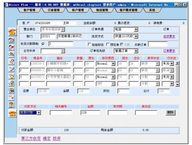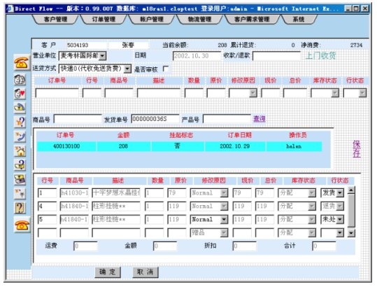 客戶根據(jù)麥考林提供的產(chǎn)品目錄告訴座席代表所需的產(chǎn)品和數(shù)量,并說明送貨方式、付款方式等信息,CRM軟件會自動計算客戶的消費金額,如果是老客戶或增在進行促銷活動,軟件會自動計算相應(yīng)的折扣。如果某種產(chǎn)品缺貨,系統(tǒng)將告訴座席代表,并提供最近到貨日期供客戶參考。購買麥考林的許多商品,會有一些小禮品贈送,CRM軟件會根據(jù)客戶訂單列出客戶可以選擇的小禮品供客戶選擇。訂單輸入完成后進行訂單入庫操作,并根據(jù)訂單的屬性自動生成相關(guān)工單派發(fā)有關(guān)部門。