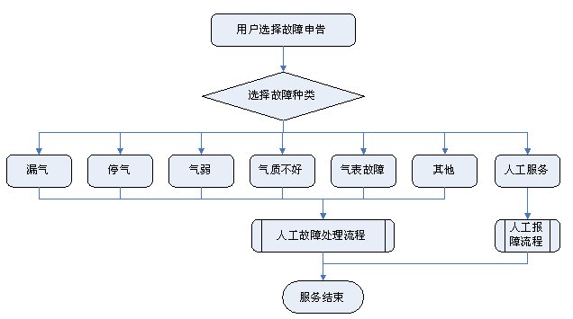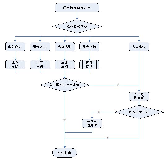 1)業(yè)務咨詢:用戶通過人工、自動語音等方式咨詢有關政策法規(guī)、資費標準、用氣常識、報裝方法等,系統(tǒng)以語音、傳真、Email、短消息等方式回復客戶。