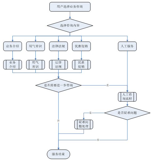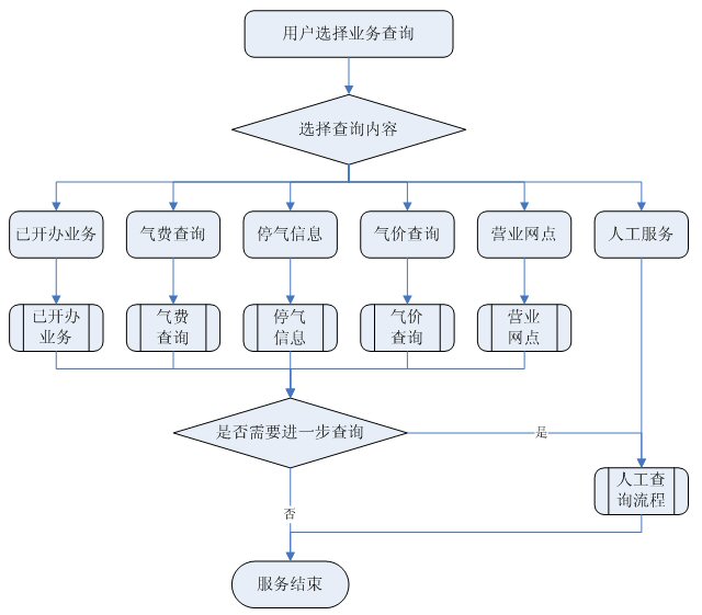 業(yè)務(wù)咨詢:用戶通過人工、自動語音等方式咨詢有關(guān)政策法規(guī)、資費標(biāo)準(zhǔn)、用氣常識、報裝方法等,系統(tǒng)以語音、傳真、Email、短消息等方式回復(fù)客戶。