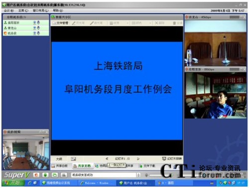CTI論壇(ctiforum)08月06日消息: 日前,京九干線主力機(jī)務(wù)段——上海鐵路局阜陽(yáng)機(jī)務(wù)段成功啟動(dòng)視維Super-V視頻會(huì)議系統(tǒng)。阜陽(yáng)機(jī)務(wù)段的領(lǐng)導(dǎo)和職工,每天早上8點(diǎn)上班后,第一件事情就是登陸視頻會(huì)議系統(tǒng),匯報(bào)前日工作情況、部署當(dāng)日工作內(nèi)容。已然,山大聯(lián)潤(rùn)為上海路局阜陽(yáng)機(jī)務(wù)段部署的阜陽(yáng)機(jī)務(wù)段視頻會(huì)議系統(tǒng),成為鐵路部門(mén)必不可少的遠(yuǎn)程溝通交流工具,在有效提高鐵路系統(tǒng)溝通效率的同時(shí),保障了鐵路運(yùn)輸?shù)陌踩,極大滿足了鐵路部門(mén)暑期運(yùn)營(yíng)業(yè)務(wù)對(duì)溝通和會(huì)議的需求。