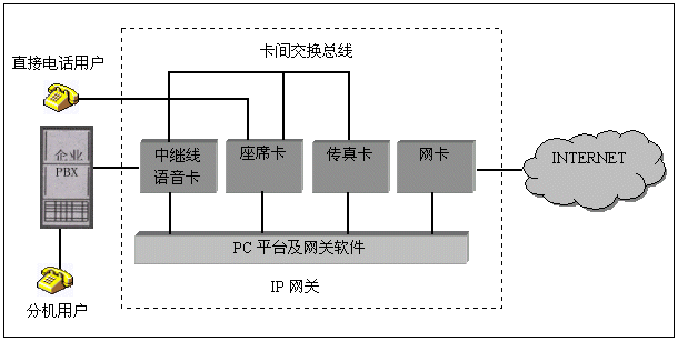 在PC機(jī)平臺(tái)內(nèi),可插入三種不同類(lèi)型的語(yǔ)音卡,中繼卡用于連接企業(yè)原有的用戶(hù)交換機(jī),使得分機(jī)用戶(hù)可以通過(guò)IP網(wǎng)絡(luò)接打電話(huà),中繼線(xiàn)可采用模擬線(xiàn)或數(shù)字中繼線(xiàn)、座席卡用于直接連接電話(huà)用戶(hù),常用于沒(méi)有用戶(hù)交換機(jī)的場(chǎng)合;傳真卡用于完成IP網(wǎng)絡(luò)上的傳真中繼功能。所有的語(yǔ)音卡之間采用卡間交換總線(xiàn)相連,以便實(shí)現(xiàn)互相通話(huà)和傳真資源共享。PC平臺(tái)內(nèi)一般還需要網(wǎng)卡實(shí)現(xiàn)與INTERNET的連接。網(wǎng)關(guān)軟件是該IP網(wǎng)關(guān)的關(guān)鍵部分,完成對(duì)語(yǔ)音卡的控制和IP協(xié)議處理。