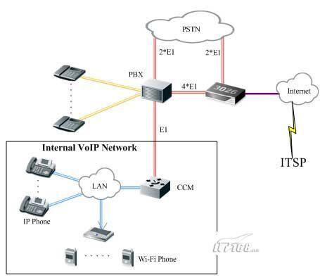 酒店申請了4條到CNC的E1線路,用于語音呼叫業(yè)務(wù),同時內(nèi)部還建設(shè)有覆蓋整個酒店的VoIP網(wǎng)絡(luò),通過CCM系統(tǒng)進(jìn)行集中管理,CCM系統(tǒng)與PBX之間通過E1線進(jìn)行連接。