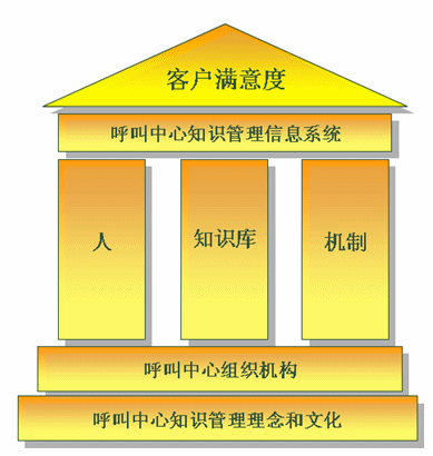 如上圖呼叫中心知識管理大廈。其是建立在呼叫中心知識管理理念文化、組織機(jī)構(gòu)基礎(chǔ)上,以人、知識庫、機(jī)制為核心,通過呼叫中心知識管理信息系統(tǒng)承載實施,以提高客戶滿意度為目的的綜合系統(tǒng)。