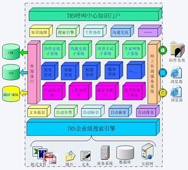 TRS Call Center 知識管理系統(tǒng)構(gòu)建在TRS企業(yè)級搜索引擎之上,融合了TRS文本挖掘技術(shù)和內(nèi)容管理技術(shù),全面包括知識庫、競爭情報、專家網(wǎng)絡(luò)、培訓(xùn)考試、溝通交流和協(xié)作交流六大子系統(tǒng),以及發(fā)布管理、審批管理、權(quán)限管理、版本控制等系統(tǒng)管理模塊;并集成面向用戶的網(wǎng)上咨詢服務(wù)系統(tǒng),提供面向客戶管理信息系統(tǒng)(CRM)、自動語音應(yīng)答系統(tǒng)(IVR)、Help