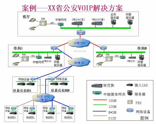 - 在全省公安IP語音專網(wǎng)系統(tǒng)覆蓋范圍以內(nèi)的用戶通過專用廣域網(wǎng)接續(xù)。省廳和各市節(jié)點(diǎn)的軟交換均通過中繼媒體網(wǎng)關(guān)與本節(jié)點(diǎn)PBX互連,全省各區(qū)縣公安局和下轄科所隊(duì)均根據(jù)接入需要配置相應(yīng)端口數(shù)的語音接入設(shè)備IAD,各節(jié)點(diǎn)之間專網(wǎng)電話匯接、路由通過IP網(wǎng)絡(luò)來完成。