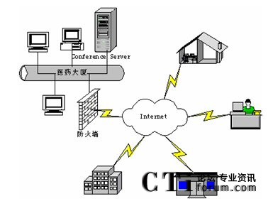 視頻會議服務(wù)器設(shè)置在上?偛,通過電信的6M帶寬接入互聯(lián)網(wǎng),并配備有廣域網(wǎng)靜態(tài)IP地址。下屬生產(chǎn)基地和分支機構(gòu)通過電信ADSL接入和光纖接入等方式接入互聯(lián)網(wǎng)。這些點能夠?qū)崿F(xiàn)網(wǎng)絡(luò)視頻會議通訊,進行音頻、視頻和數(shù)據(jù)的多方溝通。