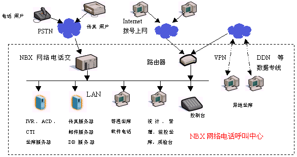 外部訪問(wèn)統(tǒng)一路由分配:NBX網(wǎng)絡(luò)呼叫中心各種外部訪問(wèn):電話、傳真、WEB、郵件進(jìn)行統(tǒng)一分配。