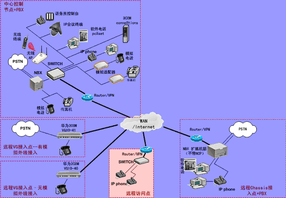 遠(yuǎn)端使用 HuaWei-3COM 的 VG 語音網(wǎng)關(guān)接入 PSTN 。