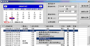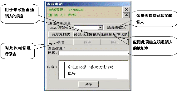 如果有電話打入時,在屏幕的右側(cè)會彈出一個對話框,它顯示了當(dāng)前來電的號碼和通話人(如果在地址簿中沒有記錄則顯示為未知),點擊彈出全部菜單功能,它相當(dāng)于一個功能強大的通話記事本,用它既可以邊接聽電話邊整理相關(guān)通話的文字記錄,又可以錄下通話的全部內(nèi)容。如果這個電話是您不愿接聽的,也可以將它設(shè)置為“免打擾”,這樣,這個號碼以后將存入免打擾名單中,若此號碼再呼入,系統(tǒng)將自動掛斷此呼叫。如果這個電話是您認(rèn)為的重要客戶打過來的,您也可以將此號碼添加到重要客戶組中,以便您今后接聽或設(shè)置電話轉(zhuǎn)移時能與其它呼入電話相區(qū)分。