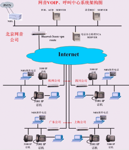 網(wǎng)音公司作為NBX產(chǎn)品總代,與全國(guó)各地的分銷(xiāo)公司之間建立一套網(wǎng)絡(luò)電話通訊系統(tǒng),本系統(tǒng)包括各公司之間的IP電話互通、分步式呼叫中心、NBX電話辦公助理、錄音等多種業(yè)務(wù)。
