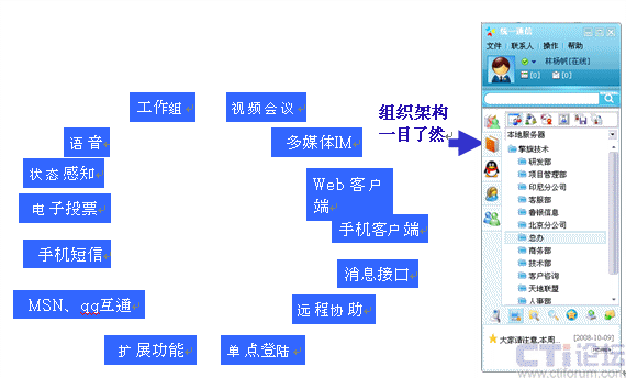 工作組:支持幾千級用戶同時在一個群組即時溝通,文件,IM,圖片支持。