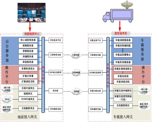 MDS系統(tǒng)還可以為通信車部署整套的車載調(diào)度平臺,方便指揮人員在突發(fā)事件現(xiàn)場實現(xiàn)對相關人員、車輛和物資的統(tǒng)一指揮調(diào)度,極大地幫助指揮人員提高快速指揮調(diào)度能力。另外,地面指揮中心和通信指揮車之間可通過衛(wèi)星網(wǎng)絡、3G網(wǎng)絡和COFDM無線網(wǎng)橋提供網(wǎng)絡通道,各種網(wǎng)絡之間互聯(lián)互通并互為備份,確保不同環(huán)境下調(diào)度網(wǎng)絡的暢通。