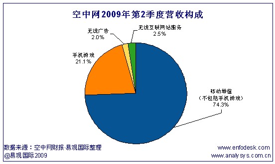 空中網(wǎng)2009年第2季度總營收為3230萬美元,其中總無線增值服務(wù)(不包括手機(jī)游戲)營收為2393萬美元,同比增長10%,比上一季度增長1%,占總營收的74.09%;手機(jī)游戲占總營收的21.05%,比上一季度增長38%;這一季度,空中網(wǎng)將無線廣告和無線互聯(lián)網(wǎng)站服務(wù)的收入共同歸為無線互聯(lián)網(wǎng)服務(wù)營收,總值為156萬美元,其中41%來自于無線廣告,59%來自于空中網(wǎng)無線互聯(lián)網(wǎng)站服務(wù)(包括虛擬物品銷售以及手機(jī)游戲和無線增值服務(wù)的交叉銷售)。易觀國際(Analysys