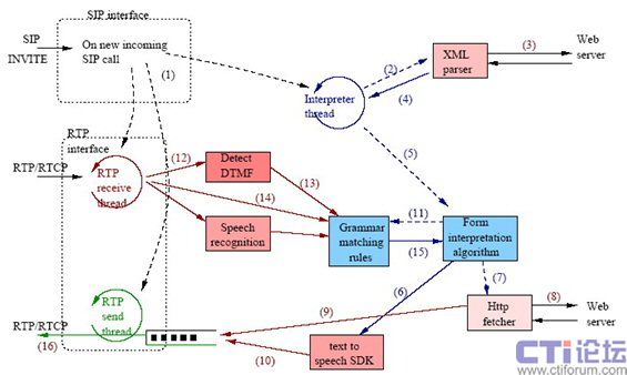 1. 當(dāng)瀏覽器接收到一個(gè)新進(jìn)來(lái)的SIP呼叫后,它創(chuàng)建三個(gè)不同線程:RTP接收線程、RTP發(fā)送線程和VoiceXML解釋器線程。RTP接收線程從主叫方接收媒體數(shù)據(jù)包并調(diào)用DTMF檢測(cè)模塊;RTP發(fā)送線程將媒體數(shù)據(jù)包以流的方式發(fā)送給主叫方。一個(gè)單獨(dú)的發(fā)送線程幫助維護(hù)外出數(shù)據(jù)報(bào)的固定帶寬(比如針對(duì)G.711音頻的64