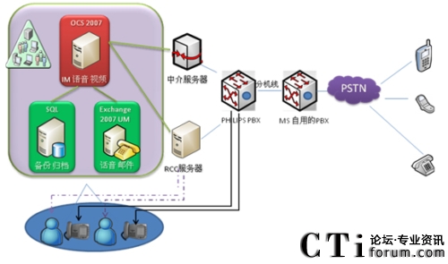 Office Communications Server 使用SIP 協議連接到PHILIPS Is3030交換機。然后通過微軟演示中的PBX再連接到本地的PSTN.