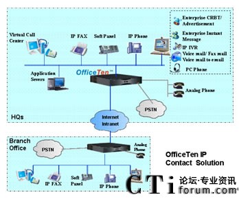IVR、IP傳真、企業(yè)MSN、企業(yè)廣告和彩鈴業(yè)務(wù),還實(shí)現(xiàn)了軟件模式的總機(jī)功能,虛擬的客戶服務(wù)呼叫中心。在企業(yè)總部或者上級(jí)中心部門同分支機(jī)構(gòu)之間,傳統(tǒng)的本地網(wǎng)電話可以通過(guò)OfficeTen直接連接到現(xiàn)有的電話網(wǎng)絡(luò),滿足本地呼叫或者客戶本地呼入的應(yīng)用;通過(guò)互聯(lián)網(wǎng)或者企業(yè)內(nèi)部專網(wǎng),實(shí)現(xiàn)企業(yè)內(nèi)部之間的IP語(yǔ)音交換或者異地之間的坐席電話交互,員工和客戶都不會(huì)感到地域的差異。