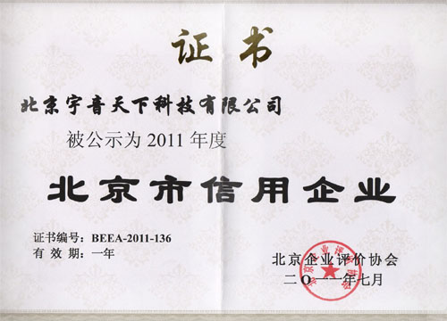 宇音天下獲評2011年度“北京市信用企業(yè)”