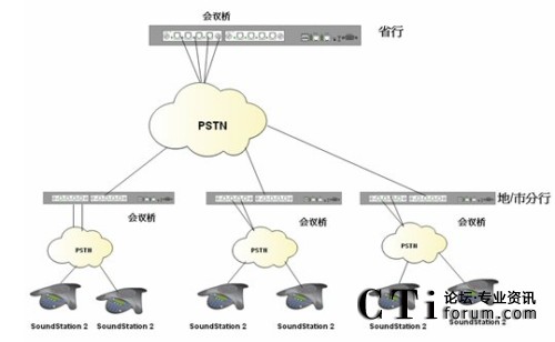 根據(jù)客戶需要在降低會議成本的前提下實現(xiàn)快速、便捷、實時的多點之間多人會議溝通的需求,我們制定了以下解決方案;系統(tǒng)利用傳統(tǒng)電話網絡,是客戶擁有自己的會議管理系統(tǒng);省行方面使用Polycom SS2基本型商務會議電話或普通模擬電話;各個市/縣級分行,根據(jù)自己會場的情況自選設備。
