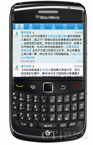 騰訊微博:用戶可在黑莓智能手機(jī)上,通過騰訊微博應(yīng)用程序,即時(shí)分享博文、消息和即時(shí)快照。