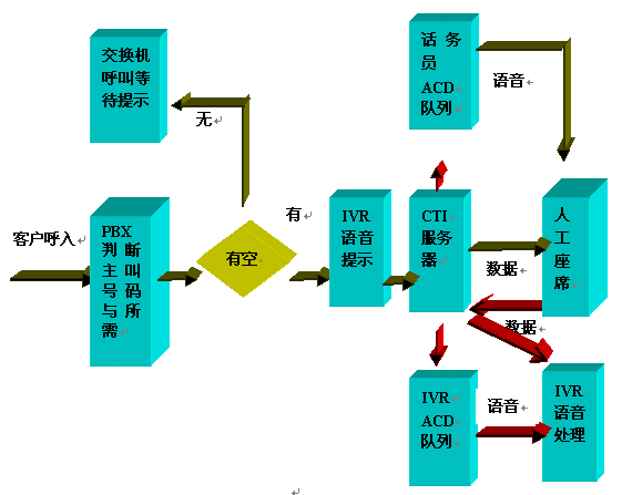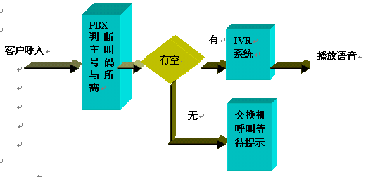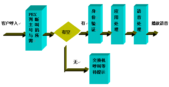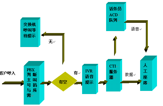 呼入一般都先通過ACD進行排隊,然后根據用戶選擇進入子系統(tǒng),流程圖如下: