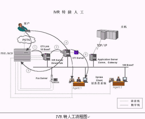 典型的客戶電話從人工服務轉接IVR的物理流程如下: