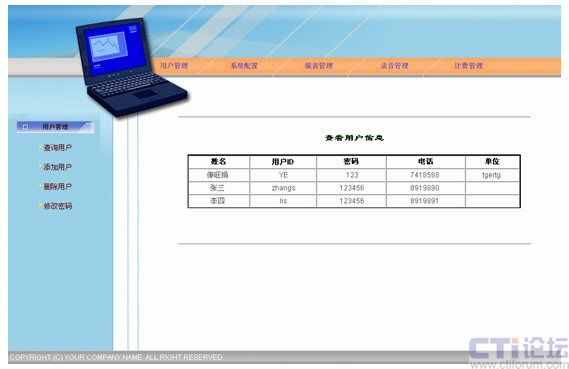 監(jiān)控功能:利用通話錄音、監(jiān)聽等手段,對服務質量進行監(jiān)控,實現對服務員的考核。