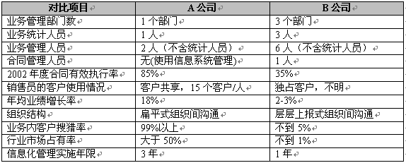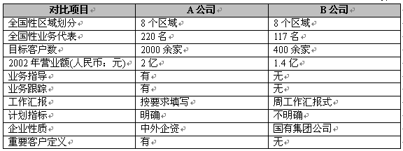在最近一次對(duì)照了兩家同具有全國(guó)性區(qū)域推廣業(yè)務(wù)的公司之后,我們發(fā)現(xiàn),精細(xì)營(yíng)銷為企業(yè)帶來的效益是顯著的。我們以A公司表示采用了精細(xì)營(yíng)銷,B公司未采用精細(xì)營(yíng)銷,表1反映兩家公司的主要數(shù)據(jù)對(duì)照: