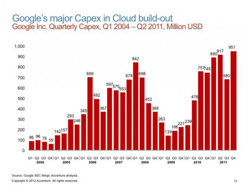 Google的季度支出。雖然這個(gè)數(shù)據(jù)與Android沒(méi)有直接關(guān)聯(lián),但是它反應(yīng)了Google在移動(dòng)領(lǐng)域和網(wǎng)絡(luò)服務(wù)方面的投資意愿