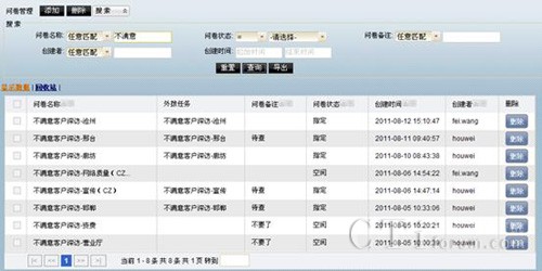 利用搜索功能,輸入搜索條件然后查詢,列表中便會(huì)出現(xiàn)質(zhì)檢的問卷結(jié)果。以及問卷中每一個(gè)問題出現(xiàn)所選擇的答案,供質(zhì)檢人員檢測、監(jiān)督問卷的真實(shí)可靠性。